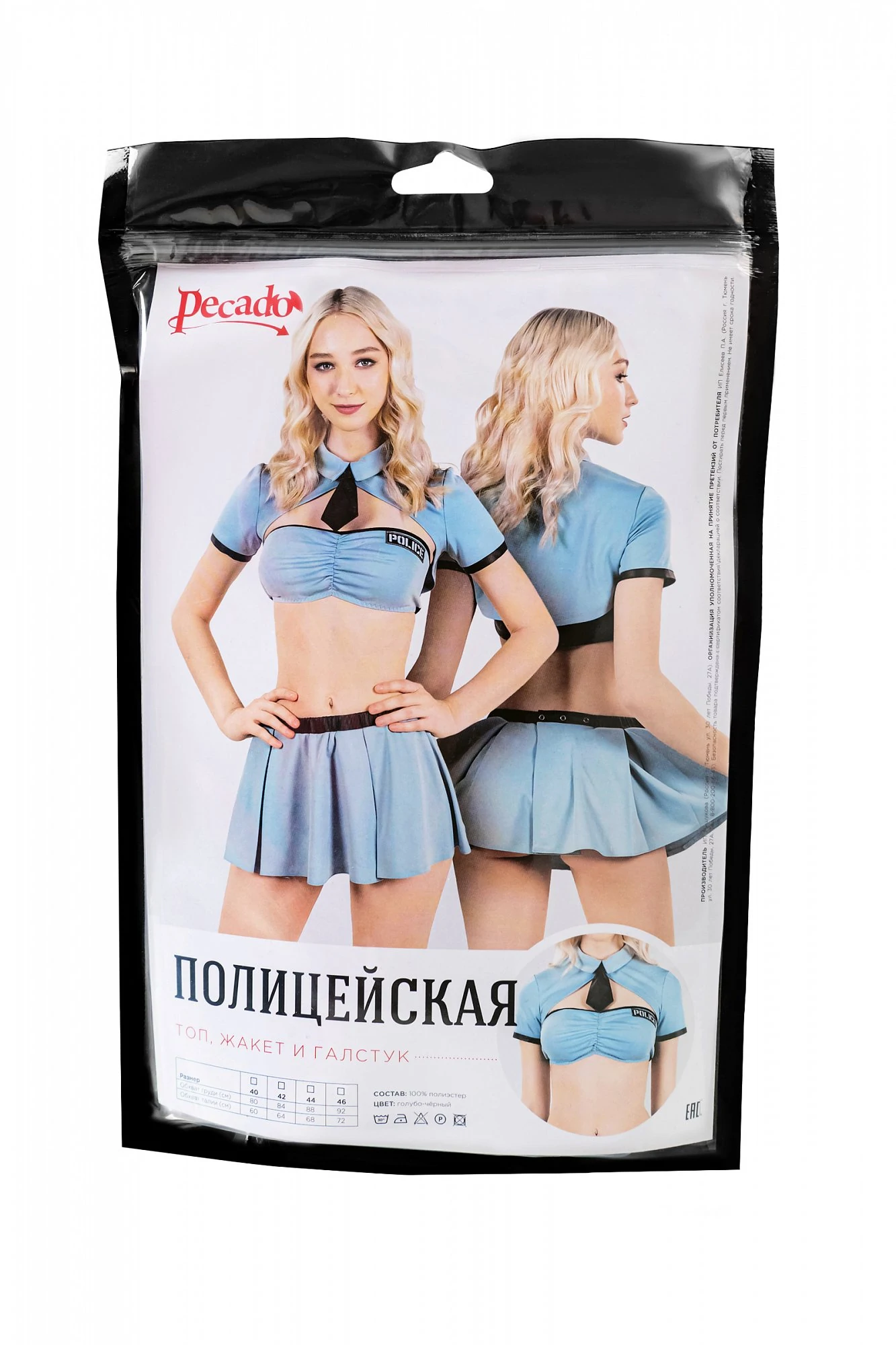 Нижняя и верхняя часть комплекта приобретаются отдельно. Именно так, Вы сможете подобрать оптимальный размер. Порадуйте своего партнера соблазнительным костюмом дерзкой полицейской. Комплект выполнен из нежно-голубого мини-топа, жакета и декоративного галстука черного цвета. Материал деталей нежный, прочный, хорошо прилегает по фигуре. Изящный лиф с нашивкой комфортно фиксируется на груди и не спадает по время ролевых игр. Накидка, пикантно прикрывает плечи и при желании легко расстегивается с помощью застежек. Мини-галстук, отлично дополняет роковой образ. Состав комплекта: топ, жакет, галстук. Материал: полиэстер и спандекс. Качественная фурнитура. Цвет: голубой, черный. Размерный ряд 40, 42, 44, 46 (Соответствует Российской размерной сетке).