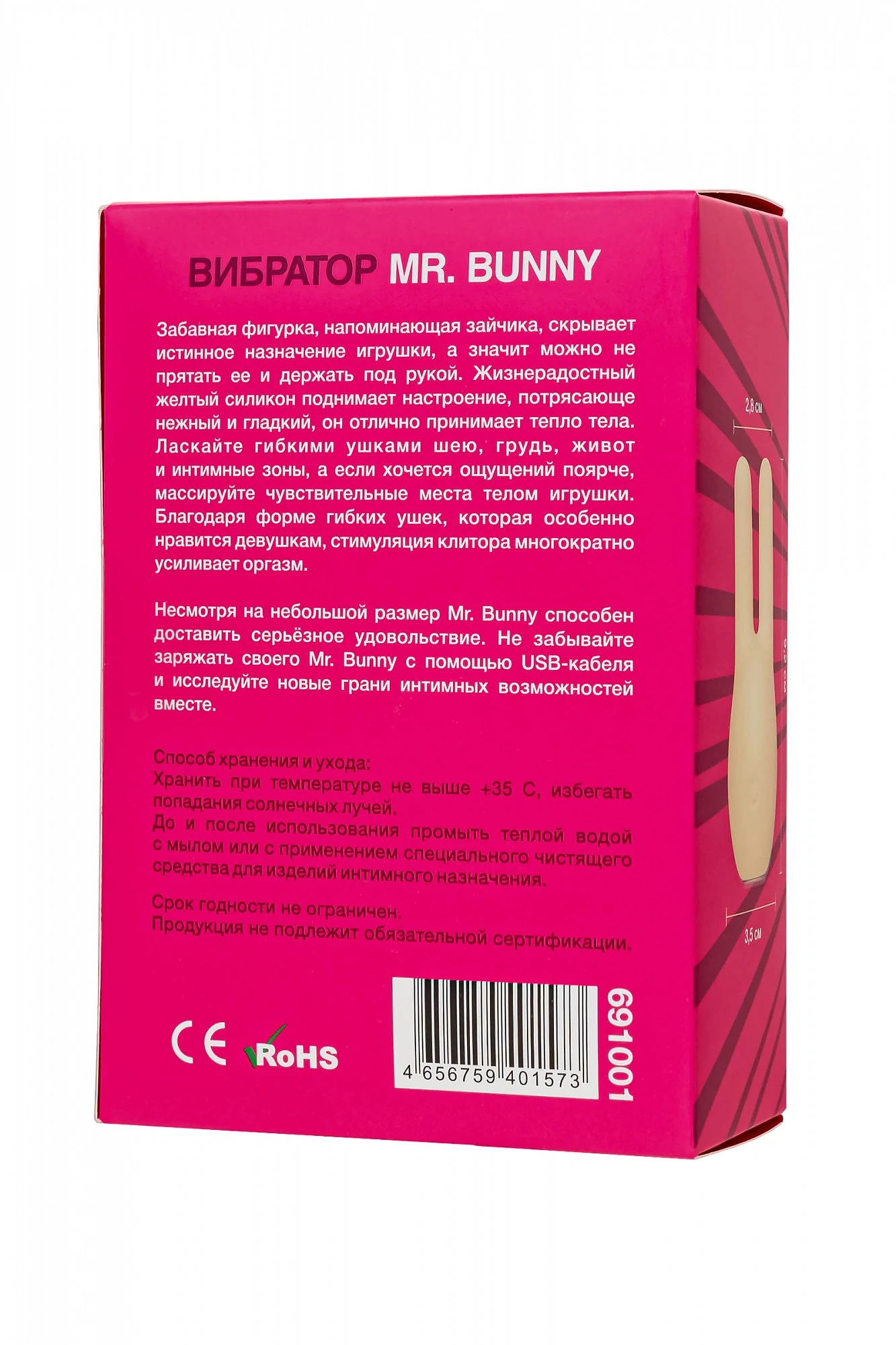 Пригласите поиграть забавного Mr. Bunny, и он с радостью составит компанию и в парной, и в одиночной игре. Симпатичный вибратор для внешней стимуляции эрогенных зон помещается в ладони. В распоряжении игроков 10 режимов вибрации и легкое управление одной кнопкой. Забавная фигурка, напоминающая зайчика, скрывает истинное назначение игрушки, а значит можно не прятать ее и держать под рукой. Жизнерадостный желтый силикон поднимает настроение, потрясающе нежный и гладкий, он отлично принимает тепло тела. Ласкайте гибкими ушками шею, грудь, живот и интимные зоны, а если хочется ощущений поярче, массируйте чувствительные места телом игрушки. Благодаря форме гибких ушек, которая особенно нравится девушкам, стимуляция клитора многократно усиливает оргазм. Несмотря на небольшой размер Mr. Bunny способен доставить серьёзное удовольствие. Не забывайте заряжать своего Mr. Bunny с помощью USB-кабеля и исследуйте новые грани интимных возможностей вместе. Размер: длина 9,2 см, диаметр 3,5 см.