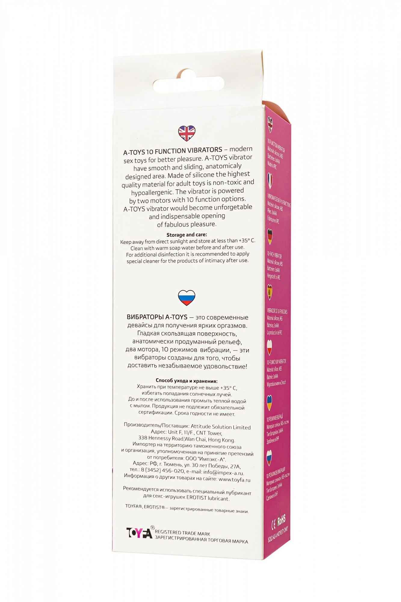 Вибратор из серии A-toys выполнен из силикона и имеет 10 режимов вибрации, 1 мотор. Элементы питания в комплет не входят, закажите пожалуйста отдельно. Размер: длина 19,2 см, диаметр 3,7 см. Для более комфортного использования рекомендуем смазку на водной основе и очищающий спрей Clear Toy 100 мл.