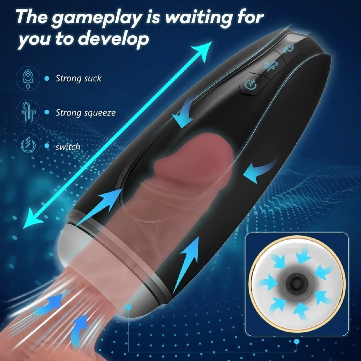 Роскошный мастурбатор внесёт яркость и разнообразие в интимную жизнь одинокого мужчины. В арсенале секс-игрушки 9 режимов вибрации и 5 режимов всасывания, а также режим сдавливания. Разнообразный функционал гаджета подарит феерию чувственных удовольствий. Разные виброрежимы повысят градус возбуждения, режимы всасывания будут имитировать страстные оральные ласки. Сдавливание пениса осуществляется в самом низу вставки, стимулируя головку полового члена. Внутренняя рельефная поверхность усиливает наслаждение. Вибрацию и вакуум можно включать по отдельности или одновременно. Если включены режимы вибрации и вакуума, то при включении режима сдавливания, они также перестают работать. При выключении режима сдавливания вибрация и вакуум начинают работать снова. Размер: длина 26,5 см, диаметр 8,8 см. Для более комфортного использования рекомендуем приобрести смазку на водной основе и очищающий спрей Clear Toy 100 мл для обработки изделия.