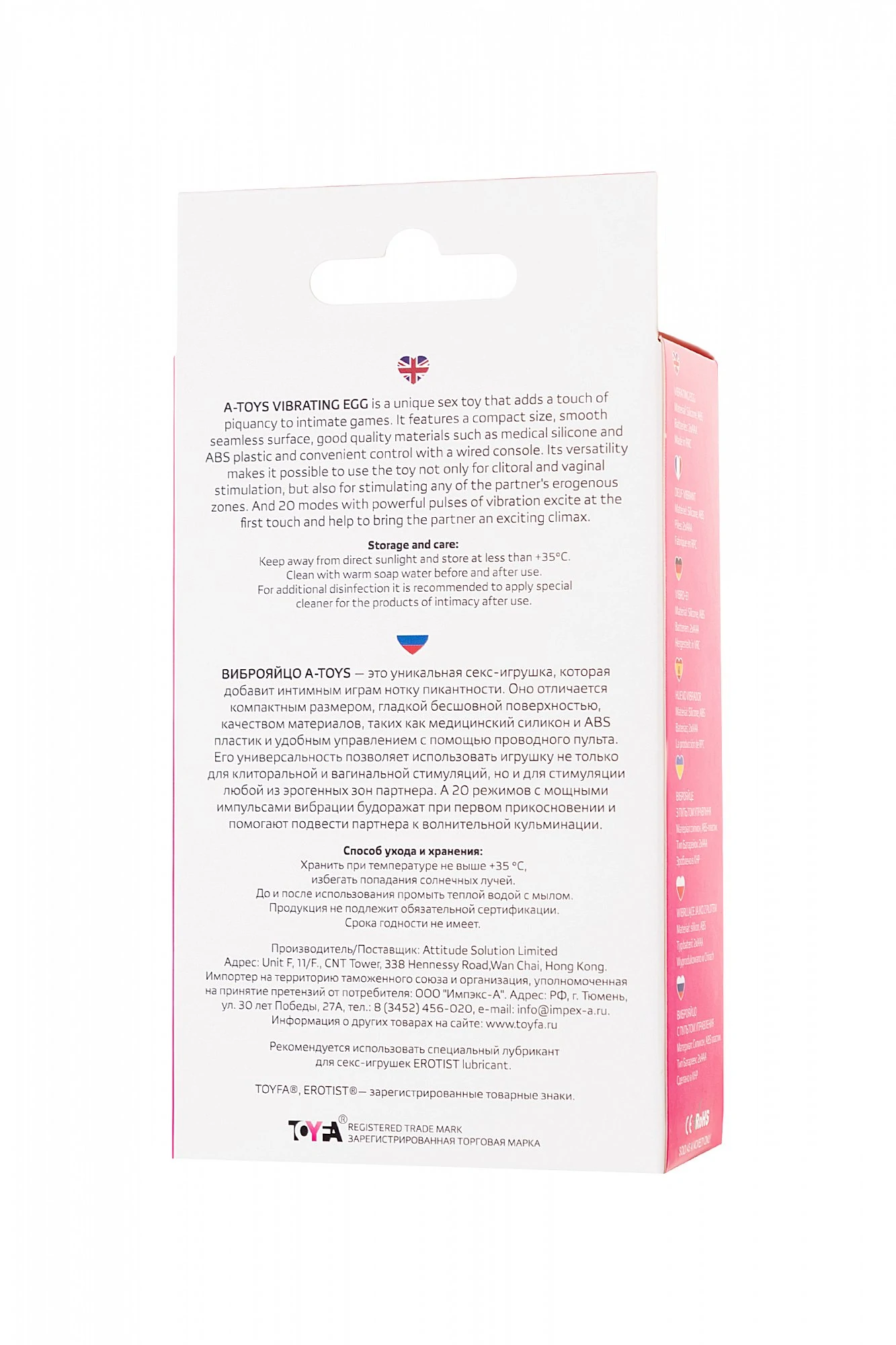 Виброяйцо A-Toys — это уникальная секс-игрушка, которая добавит интимным играм нотку пикантности. Оно отличается компактным размером, гладкой бесшовной поверхностью, качеством материалов, таких как медицинский силикон и ABS пластик и удобным управлением с помощью проводного пульта. Его универсальность позволяет использовать игрушку не только для клиторальной и вагинальной стимуляций, но и для стимуляции любой из эрогенных зон партнера. А 20 режимов с мощными импульсами вибрации будоражат при первом прикосновении и помогают подвести партнера к волнительной кульминации.