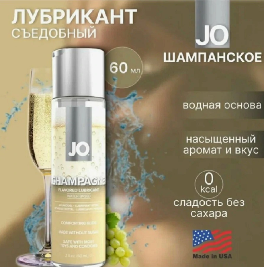 Лубрикант на водной основе со вкусом игристого шампанского. Глицерин растительного происхождения в составе. Не содержит сахара, подсластителей и алкоголя. Безопасен для проглатывания и вагинального использования. Не нарушает микрофлору и кислотно-щелочной баланс влагалища. Лубрикант имеет водную основу, но она такая же нежная как силикон, обеспечивает долгое скольжение, никакой липкости, легко смывается водой. Лубрикант совместим с материалами большинства игрушек. JO рекомендуется во всем мире врачами и фармацевтами. Обладает всеми преимуществами фаворита JO H2O, плюс приятный аромат и нежная сладость. Идеален для оральных игр. Совместим с алкоголем. Можно добавлять в напитки, использовать как топинг, смешивать коктейли из разных вкусов. Состав: Вода, глицерин, сорбат калия, гидроксиэтилцеллюлоза, натуральный