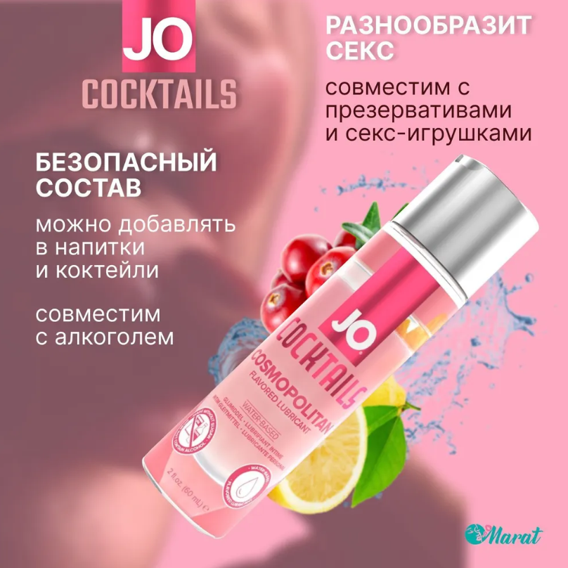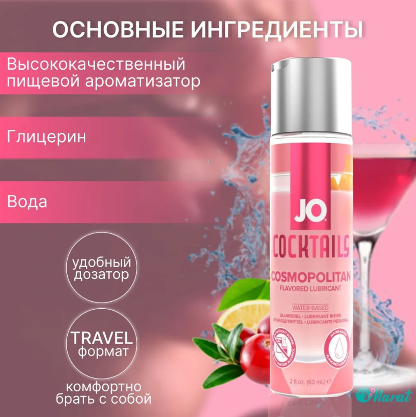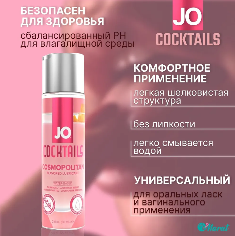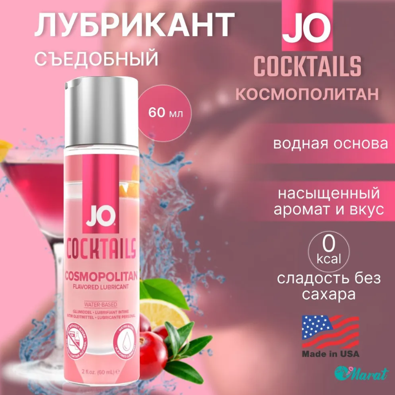 Лубрикант на водной основе со вкусом популярного коктейля Cosmopolitan. Глицерин растительного происхождения в составе. Не содержит сахара, подсластителей и алкоголя. Безопасен для проглатывания и вагинального использования. Не нарушает микрофлору и кислотно-щелочной баланс влагалища. Лубрикант имеет водную основу, но она такая же нежная как силикон, обеспечивает долгое скольжение, никакой липкости, легко смывается водой. Лубрикант совместим с материалами большинства игрушек. JO рекомендуется во всем мире врачами и фармацевтами. Обладает всеми преимуществами фаворита JO H2O, плюс приятный аромат и нежная сладость. Идеален для оральных игр. Совместим с алкоголем. Можно добавлять в напитки, использовать как топинг, смешивать коктейли из разных вкусов. Состав: Вода, глицерин, сорбат калия, гидроксиэтилцеллюлоза, натуральный