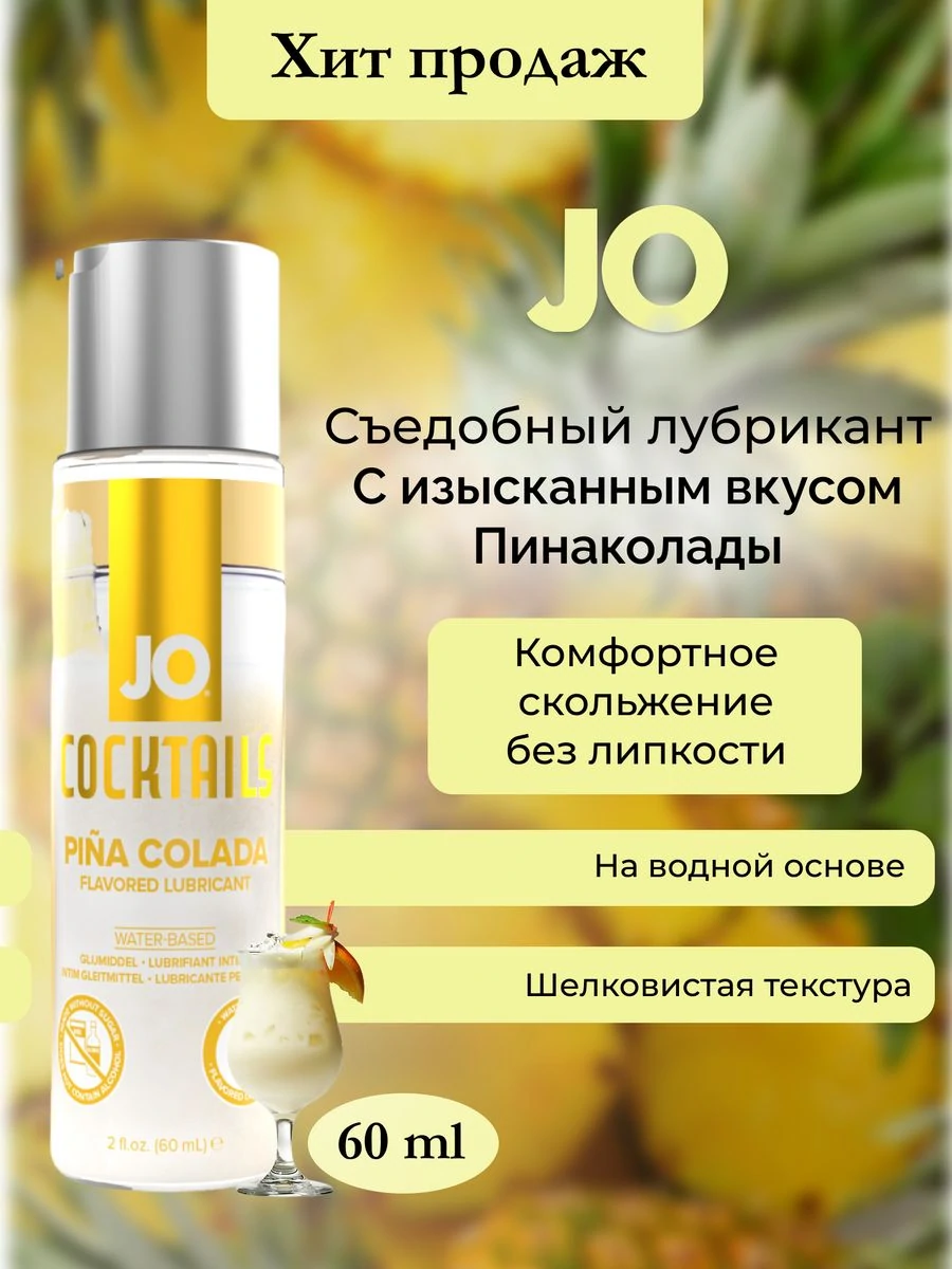 Лубрикант на водной основе со вкусом одного из самых популярных коктейлей - ПИНА КОЛАДА. Глицерин растительного происхождения в составе. Не содержит сахара, подсластителей и алкоголя. Безопасен для проглатывания и вагинального использования. Не нарушает микрофлору и кислотно-щелочной баланс влагалища. Лубрикант имеет водную основу, но она такая же нежная как силикон, обеспечивает долгое скольжение, никакой липкости, легко смывается водой. Лубрикант совместим с материалами большинства игрушек. JO рекомендуется во всем мире врачами и фармацевтами. Обладает всеми преимуществами фаворита JO H2O, плюс приятный аромат и нежная сладость. Идеален для оральных игр. Совместим с алкоголем. Можно добавлять в напитки, использовать как топинг, смешивать коктейли из разных вкусов. Состав: Вода, глицерин, сорбат калия, гидроксиэтилцеллюлоза, натуральный пищевой ароматизатор, хлорид натрия, лимонная кислота, сукралоза. Объем: 60 мл.