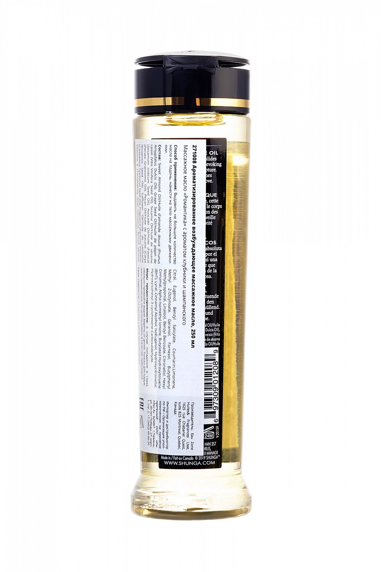 Натуральное на массажное масло с упоительными ароматами идеально подходит для взаимного расслабляющего массажа, совмещённого с чувственными ласками. Масло легко скользит по коже, не оставляя жирной пленки. В отличие от большей части средств SHUNGA, ароматизированных вкусовыми ароматами, запах массажному маслу придают эфирные масла и ароматы, что делает его несъедобным. Изготовлено из натуральных масел холодного отжима. Не оставляет жирных пятен. Содержит Витамин Е (антиоксидант). Не закупоривает поры кожи. Не содержит минеральных или животных масел. Применение: налейте небольшое количество на ладонь и разогрейте масло в ладонях, чтобы оно приобрело температуру тела. При желании вы можете нагреть масло в горячей воде для более горячего массажа. Для полного массажа тела. Избегать контакта с интимными зонами. Обратите внимание на то, что данное массажное масло ароматизировано эфирными маслами и отдушками, а, следовательно, не съедобно. Не рекомендуется в качестве персонального лубриканта. Объем: 240мл.