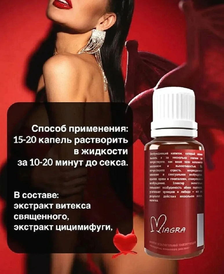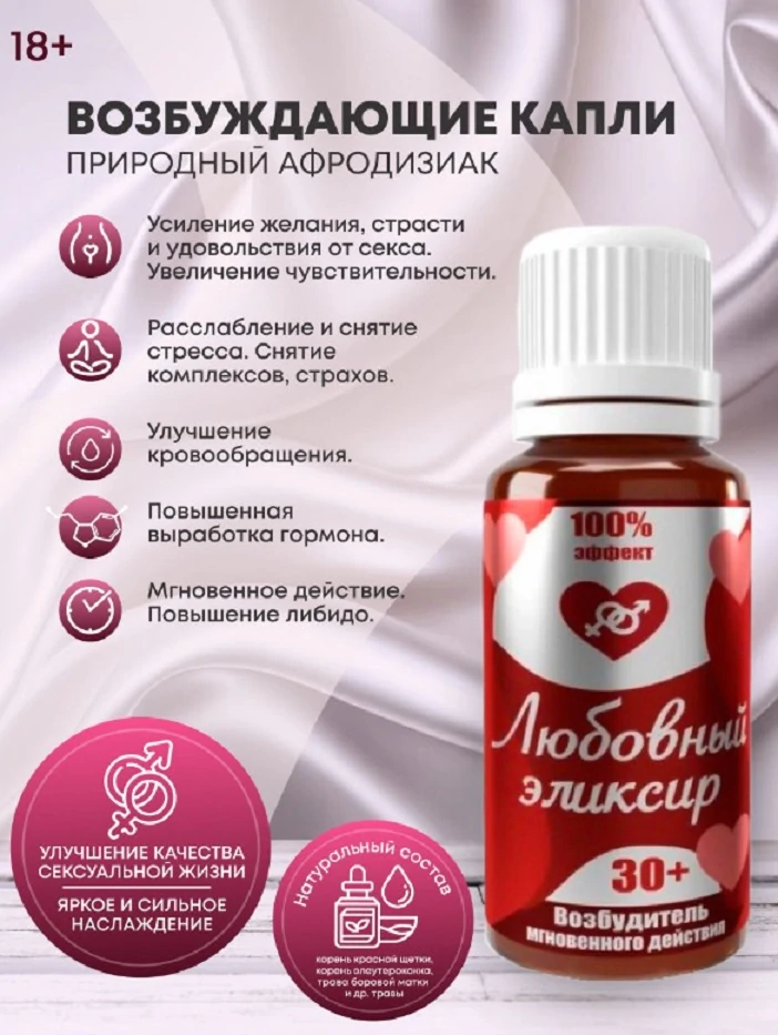 Возбуждающий напиток, который можно выпить и за несколько глотков вы почувствуете, как ваше тело наполнится желанием и выносливостью. Вы почувствуете страсть, непреодолимое желание и сексуальное возбуждение, прилив крови к гениталиям, стимуляцию и возбуждение. Эликсир значительно повышает возбудимость обоих партнеров, усиливает эрекцию и либидо – всё это результат действия нескольких капель напитка. Способ применения: 10-15 капель растворить в жидкости за 10-20 минут до секса. Эликсир не является лекарственным средством, возможны побочные действия.