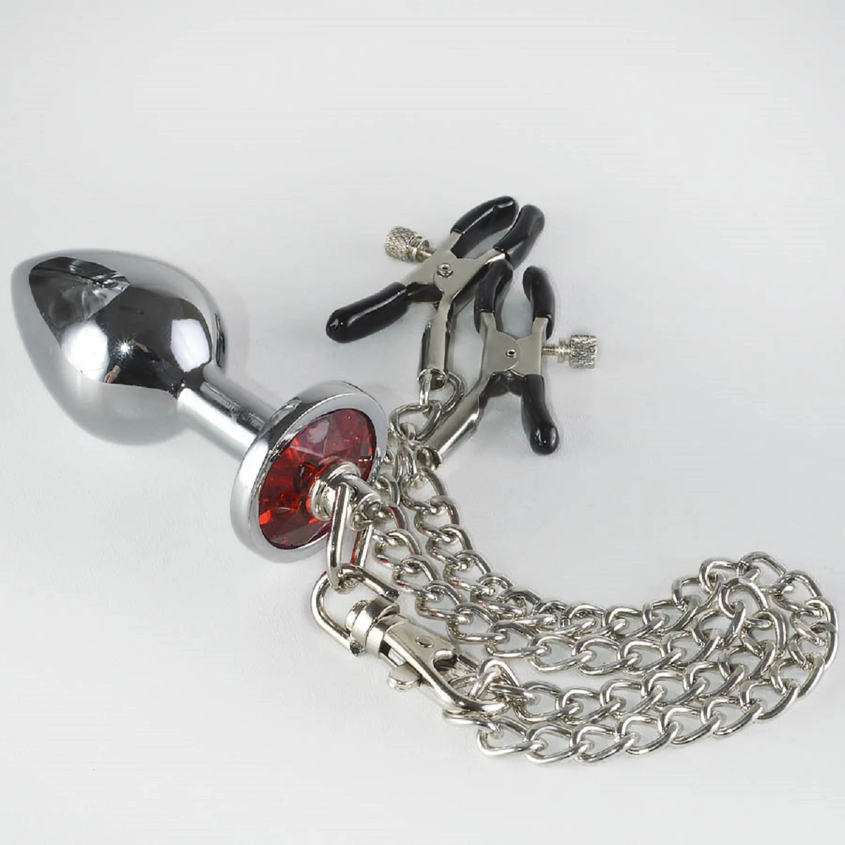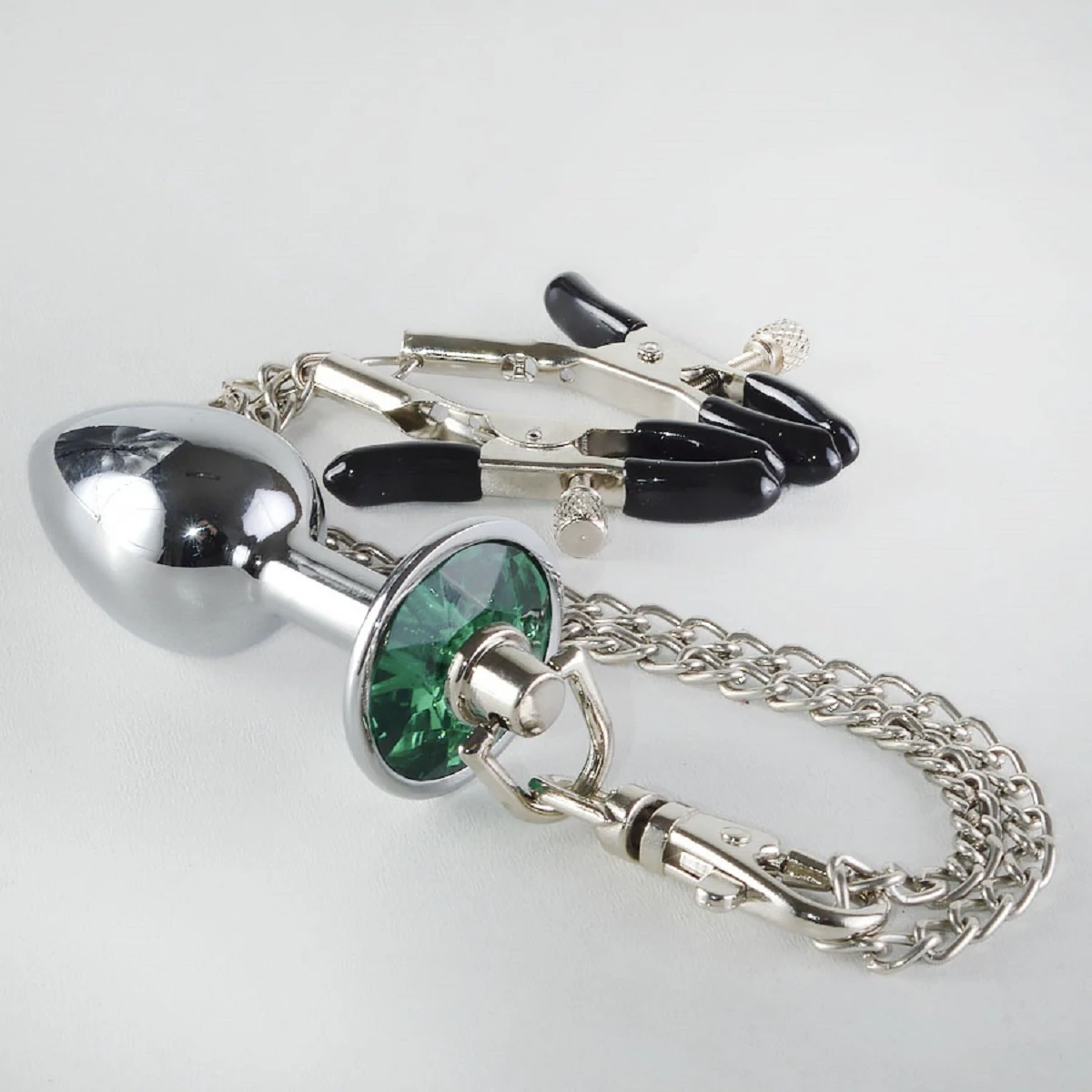Зажимы для половых губ с анальной пробкой - это девайс, с помощью которого Вашей фантазии не будет предела, а так же подарит Вам приятные ощущения сладкой боли. Зажимы оснащены пружинным механизмом, за счет чего легко и удобно фиксируются на месте, винтики позволяют отрегулировать степень давления в соответствии с индивидуальными предпочтениями. Цвет кристалла может может быть различным (синий, розовый, красный, зеленый, голобой) уточнять у менеджера. Размер: общая длина цепочки 40 см, длина втулки 6,5 см, диаметр 2,6 см. Для более комфортного использования рекомендуем приобрести смазку на водной основе и очищающий спрей Clear Toy 100 мл для обработки изделия.