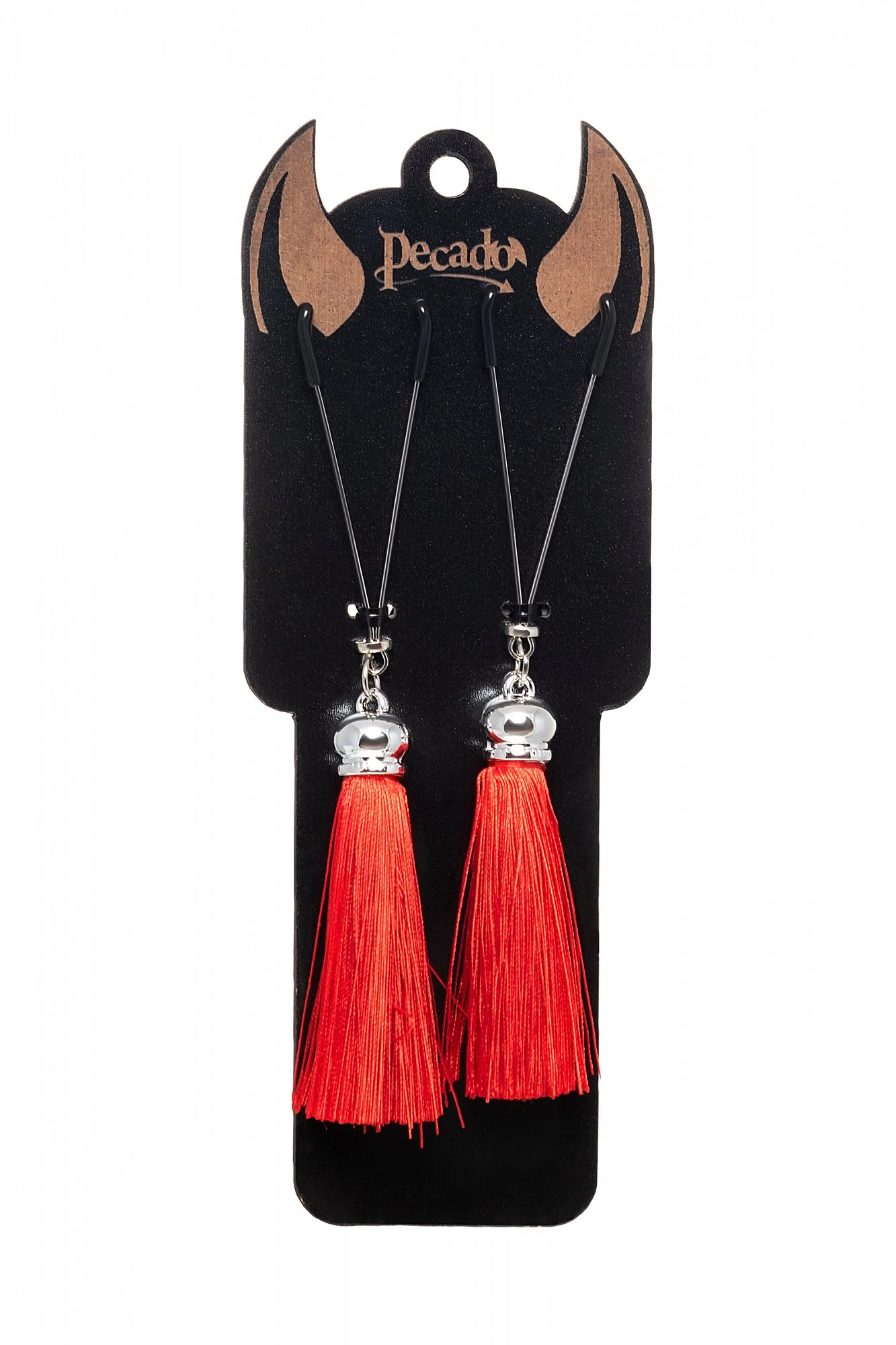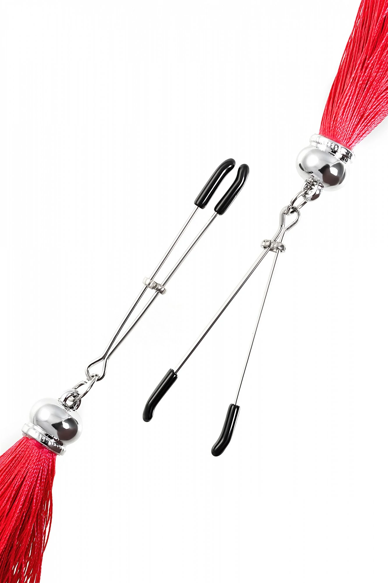 Попробуйте новые, дерзкие ощущения глубокого наслаждения! Зажимы-вилки от Pecado гарантируют смешение ярких чувств от тактильного контакта с нежной кожей сосков. Зажимы выполнены из высококачественных материалов. Металлическая часть компактная, приятная на ощупь. На концах черные резиновые наконечники, для безопасного воздействия на эрогенные зоны. Интенсивность сжатия аксессуара регулируется миниатюрными колечками. В зависимости от личных предпочтений и сценария игры, можно выбрать легкое пощипывание, или сильное сдавливание. Бахрома из натурального шелка, в насыщенном красном цвете, добавляет манящую красоту смелому атрибуту. При каждом соблазнительном покачивании груди, кисточки движутся в пикантном ритме. Также подходит для стимуляции и возбуждении в области половых губ и клитора.