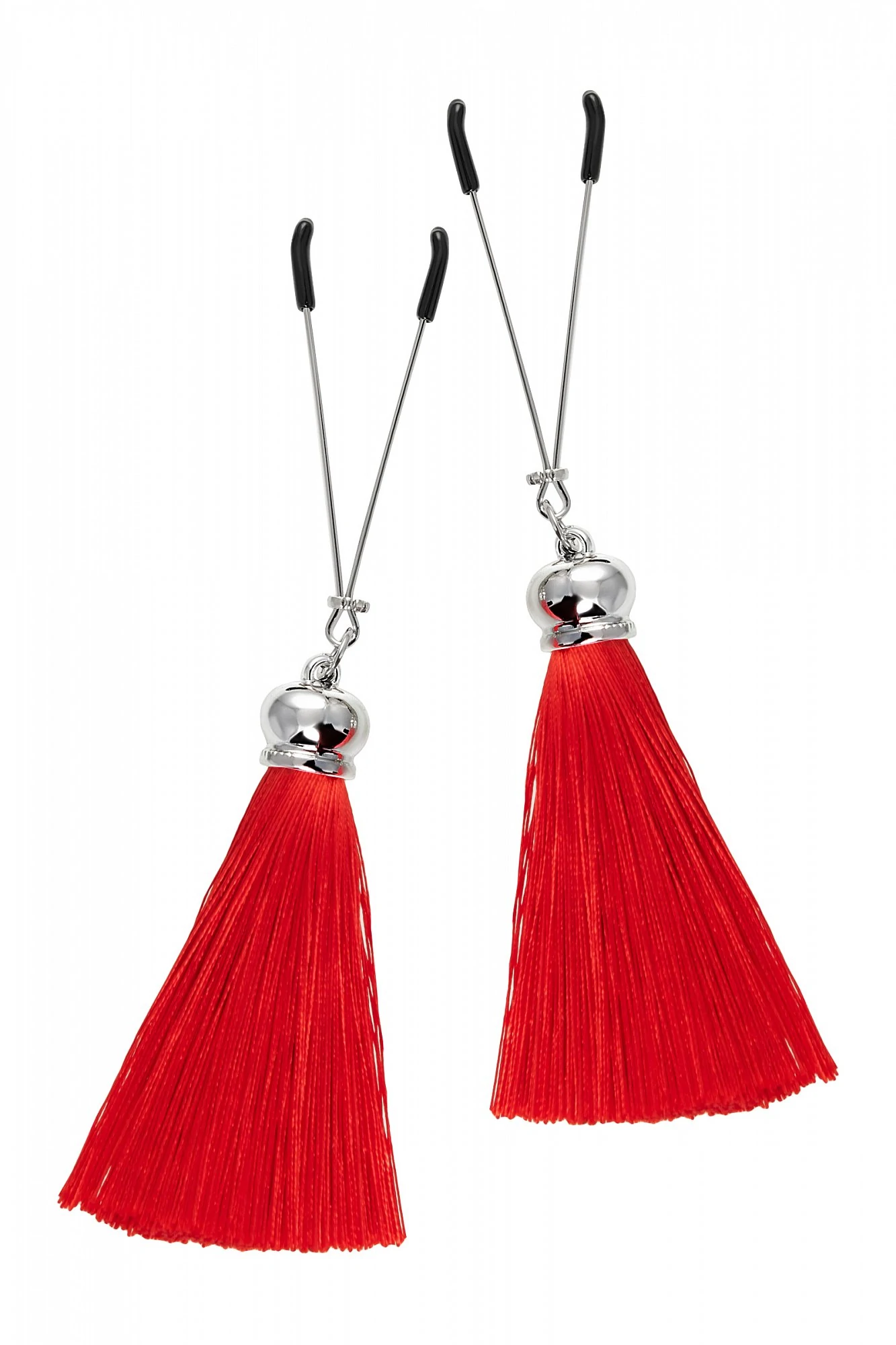 Попробуйте новые, дерзкие ощущения глубокого наслаждения! Зажимы-вилки от Pecado гарантируют смешение ярких чувств от тактильного контакта с нежной кожей сосков. Зажимы выполнены из высококачественных материалов. Металлическая часть компактная, приятная на ощупь. На концах черные резиновые наконечники, для безопасного воздействия на эрогенные зоны. Интенсивность сжатия аксессуара регулируется миниатюрными колечками. В зависимости от личных предпочтений и сценария игры, можно выбрать легкое пощипывание, или сильное сдавливание. Бахрома из натурального шелка, в насыщенном красном цвете, добавляет манящую красоту смелому атрибуту. При каждом соблазнительном покачивании груди, кисточки движутся в пикантном ритме. Также подходит для стимуляции и возбуждении в области половых губ и клитора. Ручная работа. Надежная высококачественная фурнитура. 100% натуральный шелк. Размер: общая длина зажимов 14 см, длина кисточки 8,5 см. Не требуют специального ухода.