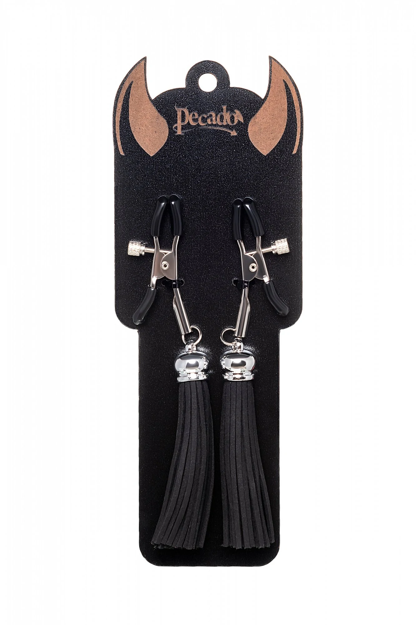 Попробуйте новые, дерзкие ощущения глубокого наслаждения! Зажимы-вилки от Pecado гарантируют смешение ярких чувств от тактильного контакта с нежной кожей сосков. Зажимы выполнены из высококачественных материалов. Металлическая часть компактная, приятная на ощупь. На концах черные резиновые наконечники, для безопасного воздействия на эрогенные зоны. Интенсивность сжатия аксессуара регулируется миниатюрными колечками. В зависимости от личных предпочтений и сценария игры, можно выбрать легкое пощипывание, или сильное сдавливание. Бахрома из натуральной замши, черного цвета, добавляет манящую красоту смелому атрибуту. При каждом соблазнительном покачивании груди, кисточки движутся в пикантном ритме. Также подходит для стимуляции и возбуждении в области половых губ и клитора. Ручная работа. Надежная высококачественная фурнитура. 100% натуральная замша. Размер: общая длина зажимов 14 см, длина кисточки 8,5 см. Не требуют специального ухода.