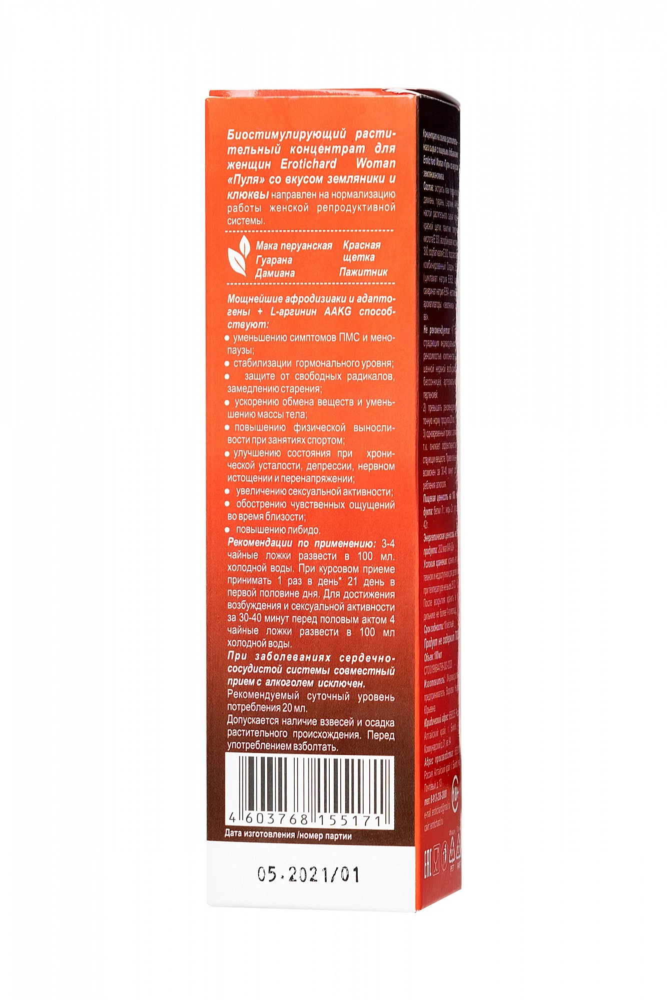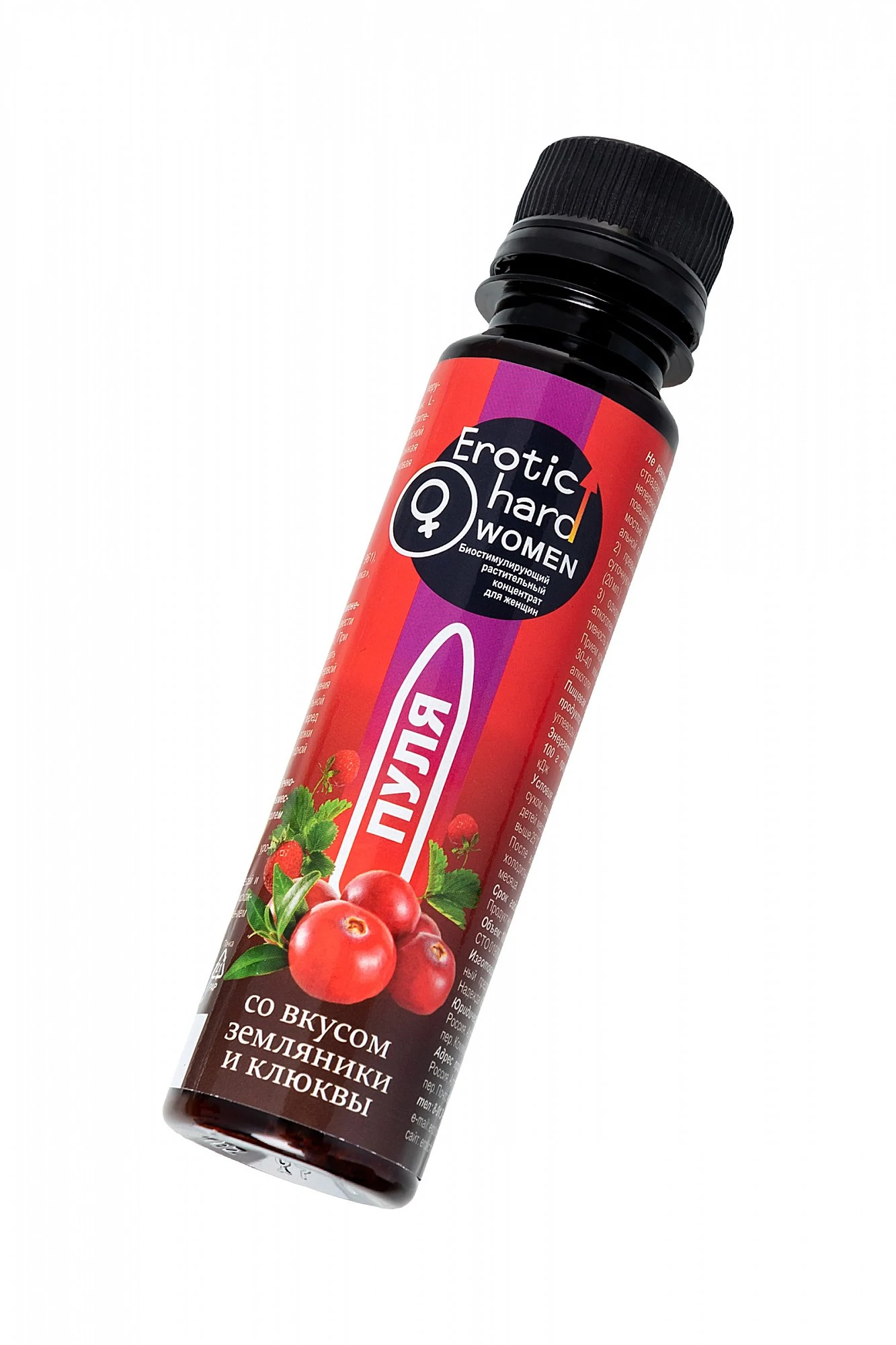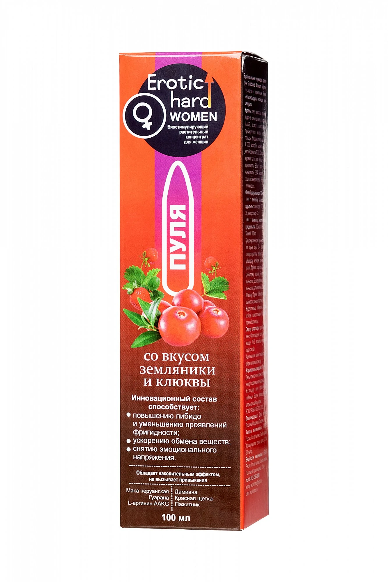 В любом возрасте женщины хотят оставаться сексуально активными, здоровыми, молодыми и привлекательными. Биостимулирующий растительный жидкий концентрат Erotic hard Woman Пуля со вкусом земляники и клюквы разработан специально для женщин. За счет натуральных растительных компонентов в составе, Erotic hard Woman Пуля оказывает положительный эффект на работу всех основных систем организма. А мощные природные афродизиаки благотворно влияют на половую функцию. Концентрат со вкусом земляники и клюквы не содержит сахара, в его составе натуральный подсластитель Сладин 250L, при этом содержание калорий всего 1 Ккал на 100 г. Принимать его безопасно для фигуры и полезно для организма, ведь в 20 мл содержится максимально допустимая суточная доза активных компонентов, в отличие от сиропов. Биостимулирующий растительный жидкий концентрат для женщин Erotic hard Woman Пуля усиливает либидо, стимулирует сексуальное влечение и возбуждение; добавляет чувственность и яркость оргазмам; повышает физическую выносливость.